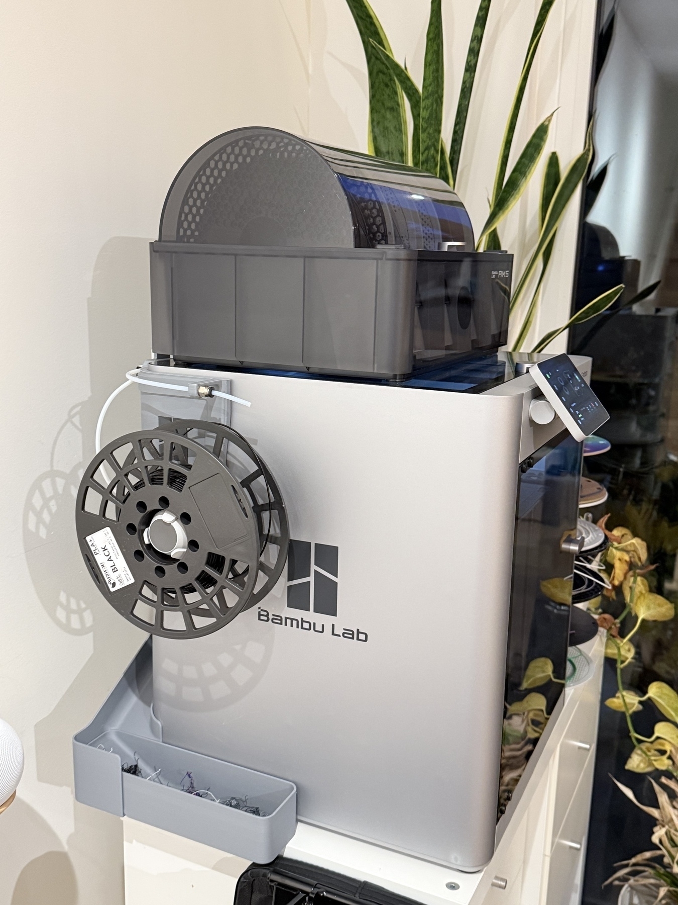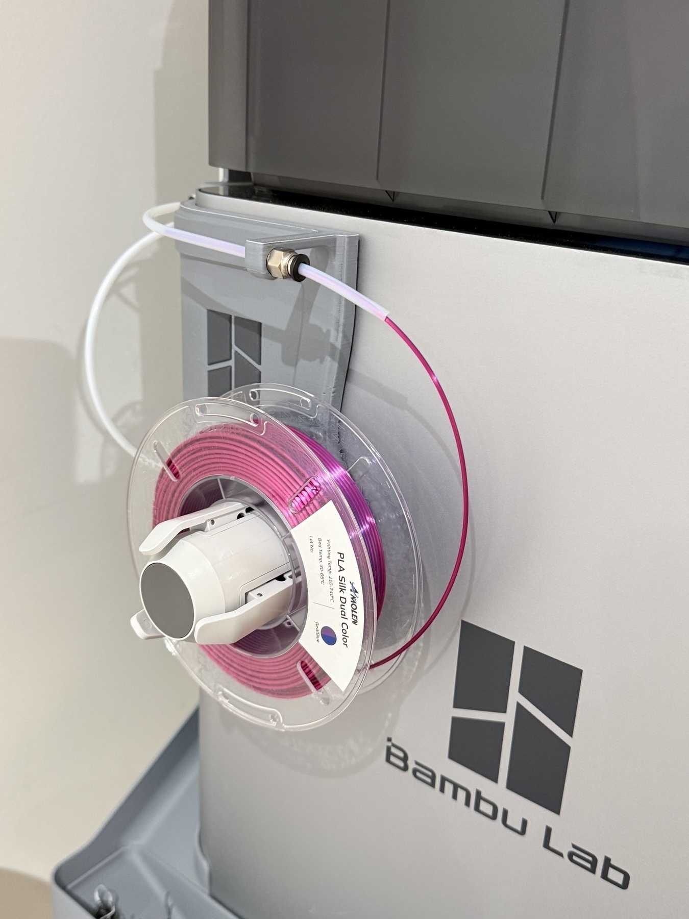 Printed a side-mount external reel holder for the 3D printer. Saves me from awkwardly having to reach behind to mount an external reel, and also switching the PTFE feed tube.